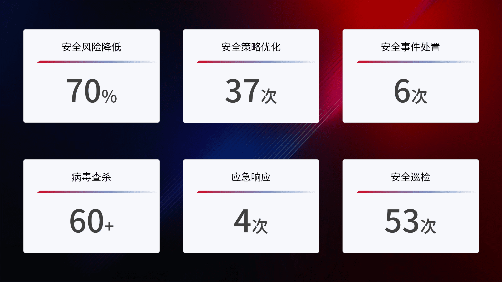 提供全面的安全事件报告体系,,,包括处置报告、、周报、、、季度和年度总结,,,结合持续监控,,,,帮助客户深入了解网络安全状况。。